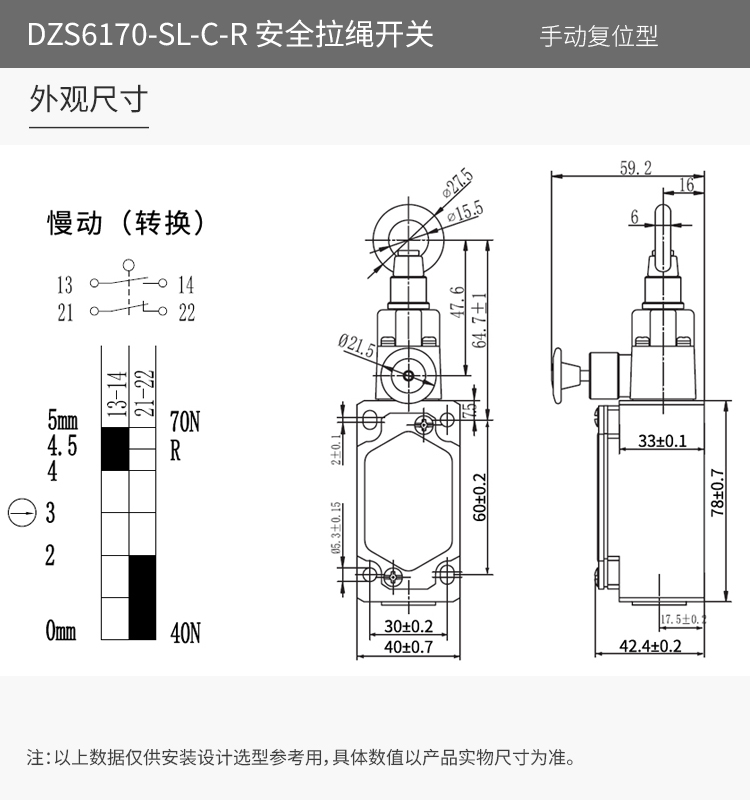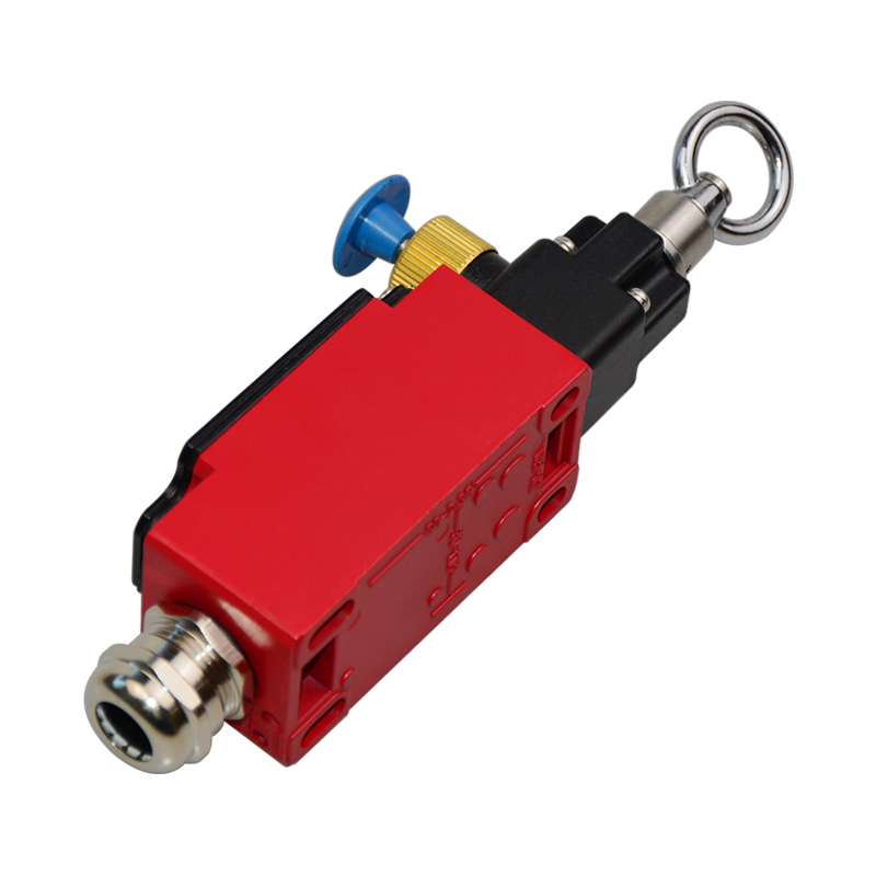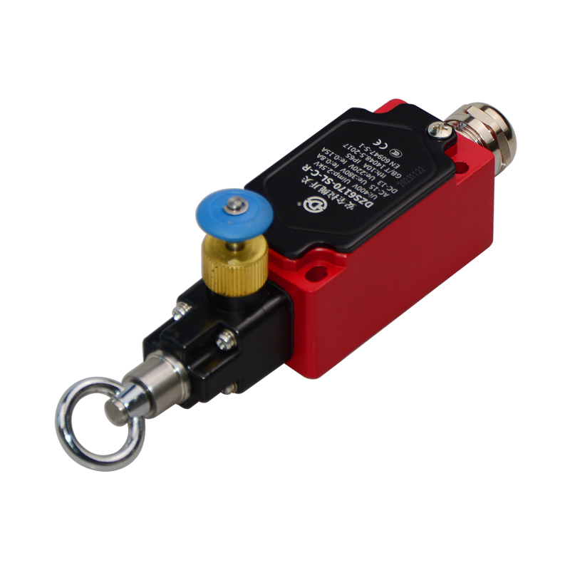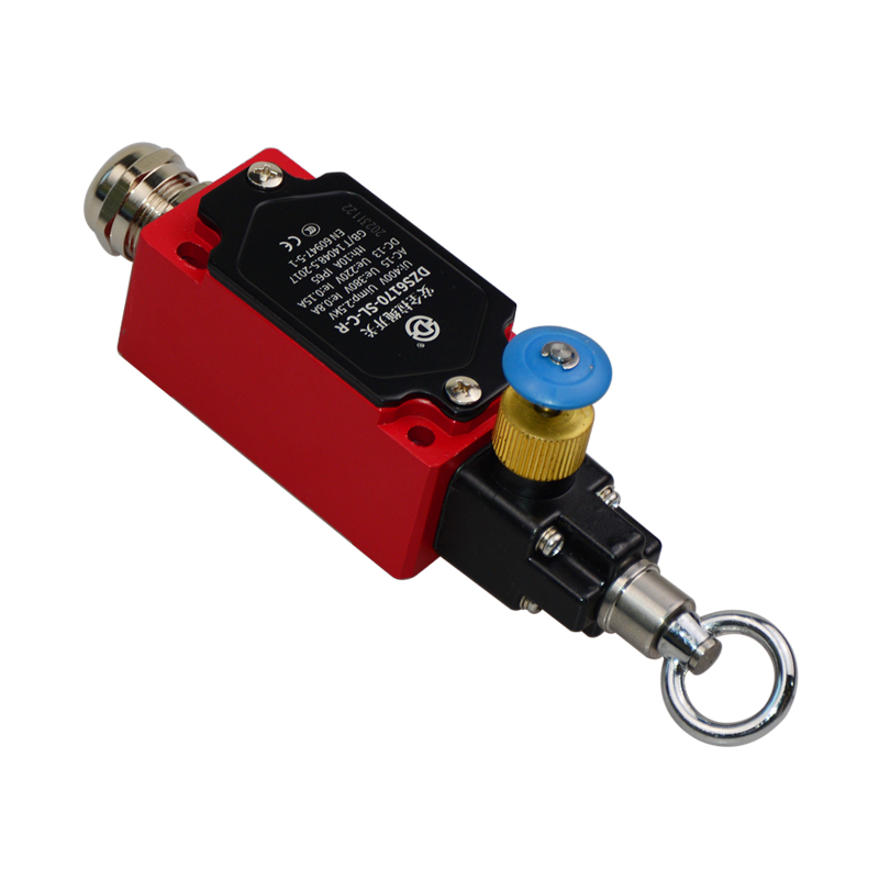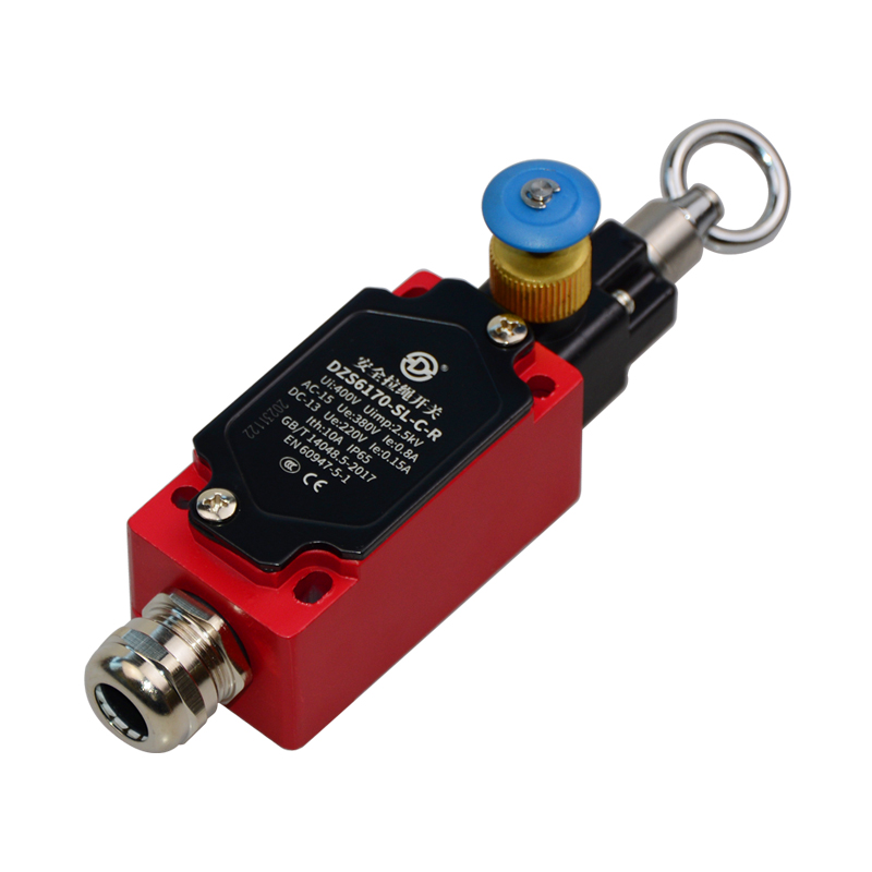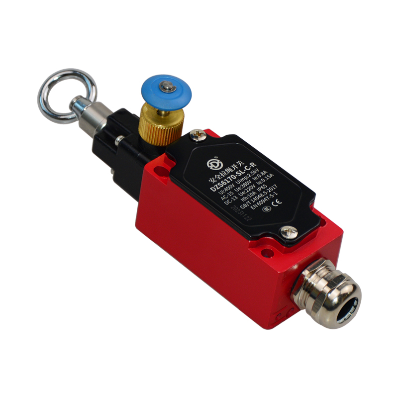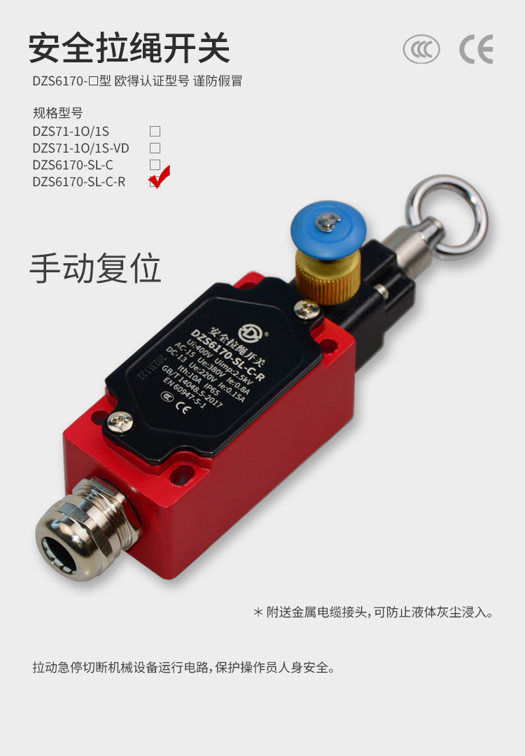 • DZS6170-SL-C-R安全拉繩開(kāi)關(guān),拉動(dòng)式、急停鎖定型,藍(lán)色按鈕為手動(dòng)復(fù)位鍵。默認(rèn)接點(diǎn)為2回路(1常開(kāi)1常閉)、可定制非標(biāo)2常閉(2NC)。金屬殼體,堅(jiān)固耐用。適用于流水線、輸送帶、高空作業(yè)車等機(jī)械設(shè)備位移信號(hào)控制,保護(hù)操作員不受機(jī)器傷害。額定絕緣電壓400伏,發(fā)熱電流10安培,工作電壓交流380伏、電流0.8安培,直流220伏、電流0.15安培,防護(hù)等級(jí)IP65,戶外使用請(qǐng)注意防水措施。