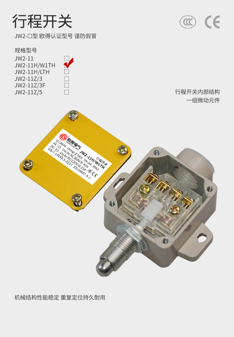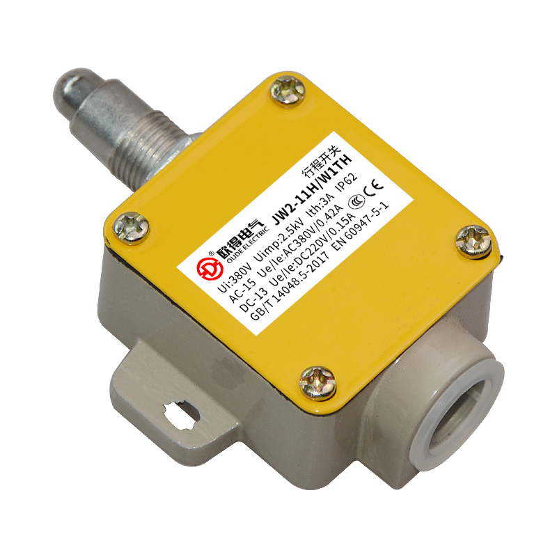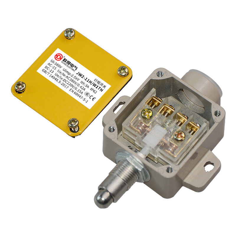 • 行程開關(guān)(JW2-11H/W1TH),柱塞直動式。絕緣電壓380伏,發(fā)熱電流3安培,交流工作電壓380伏、電流0.42安培,直流工作電壓220伏、電流0.15安培,防護等級IP62。